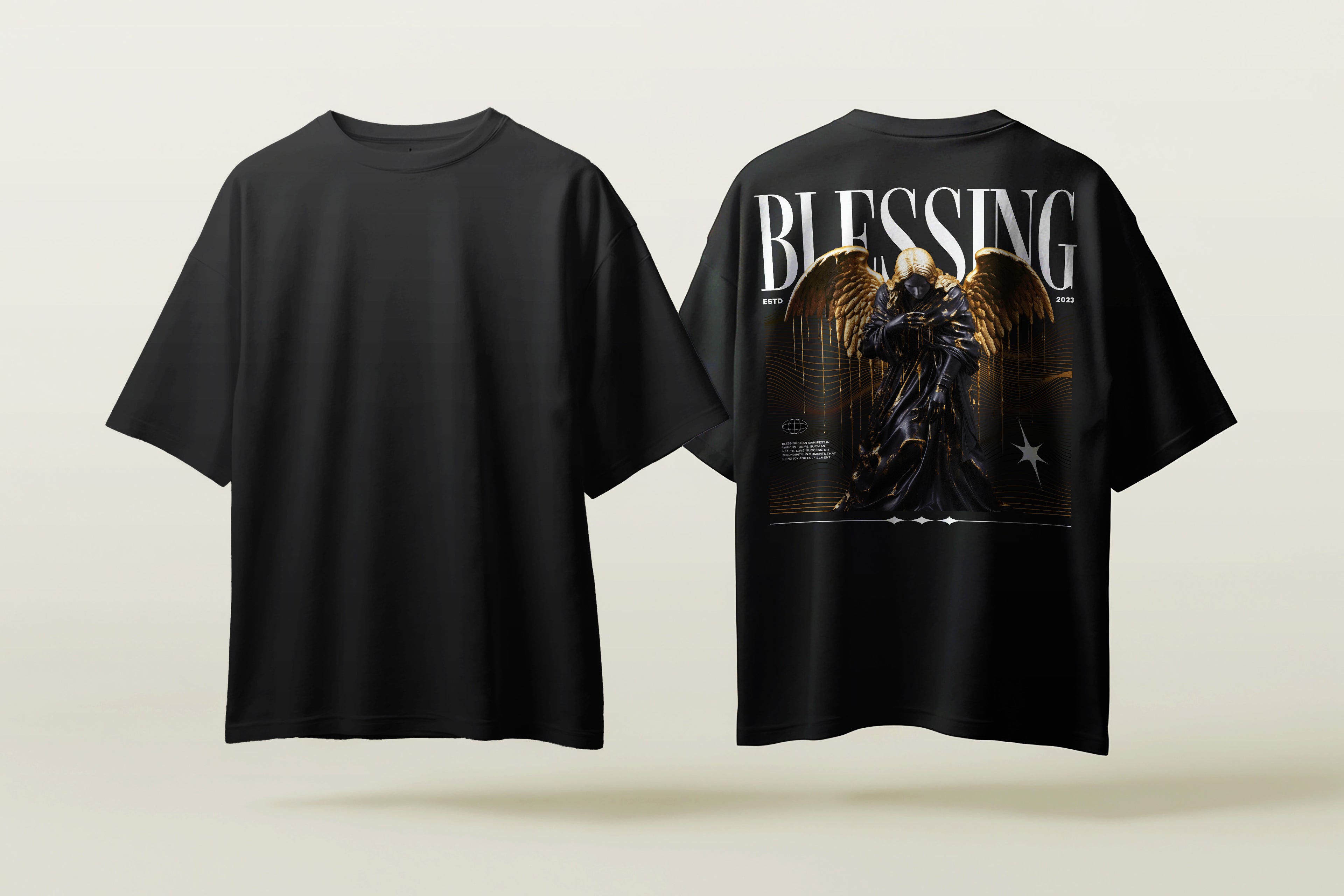Diseños streetwear con iconografía de ángeles, mezclando lo clásico con lo urbano.
